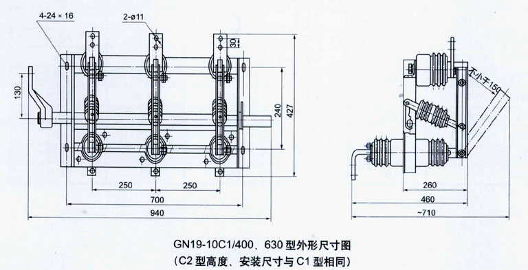 GN19-10C型戶內(nèi)三相高壓隔離開關(guān)由底座、支柱瓷絕緣子、瓷套、操作瓷絕緣子和導(dǎo)電部分組成。